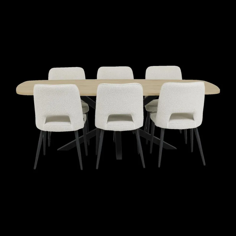 Eetkamer JAKARTA: Dressoir + Barkast smal + Tafel 225×100 + 4x stoelen ALICIA Touch Pearl