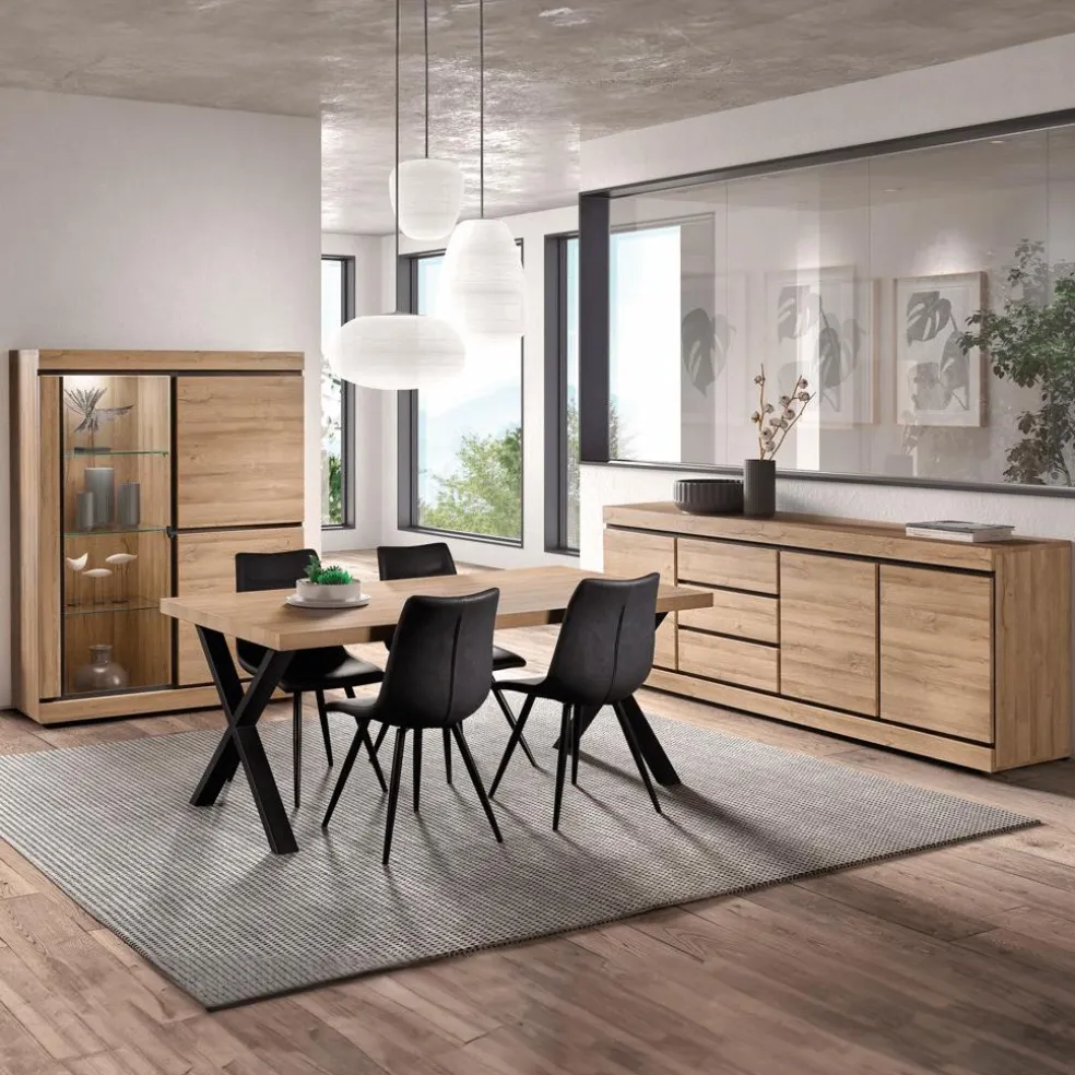 Eetkamer MACOUN: Dressoir + Glaskast + ABBEY Tafel + 4 stoelen LORRY zwart