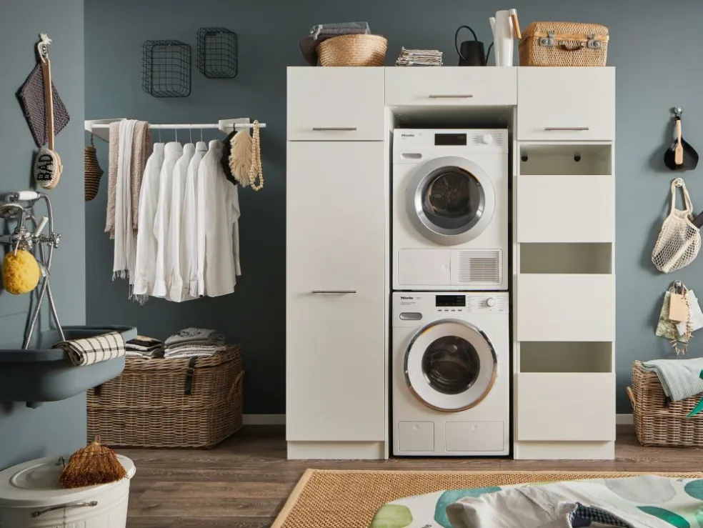 Wasruimteset LAUNDRY: Bergkast + Opzetkast smal X2 + Wasmachinekast hoog + Linnenkast